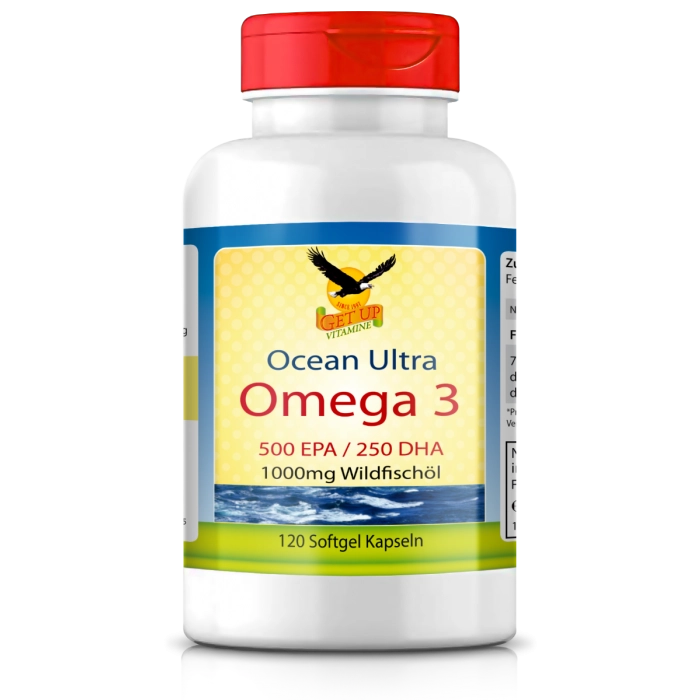 Omega 3 Ultra versorgt Sie mit 1.000 mg Fischöl pro Softgel und dem idealen hochdosierten Verhältnis von 50% EPA (Eicosapentaensäure) und 25% DHA (Docosahexaensäure) pro Softgel– und das in bester Bioverfügbarkeit und Qualität von Get UP.